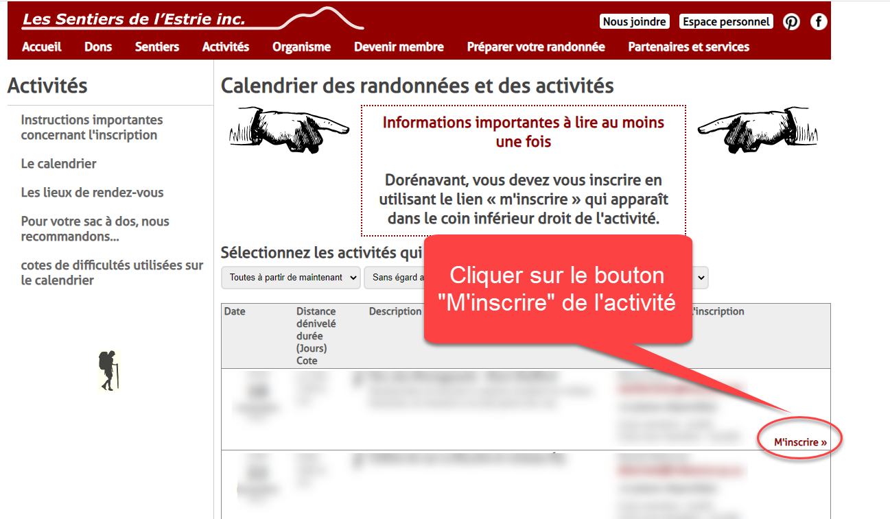 Pour vous inscrire à une activité, vous devez cliquer sur le lien "m'inscrire". Voir ici » si le lien n'est pas disponible.