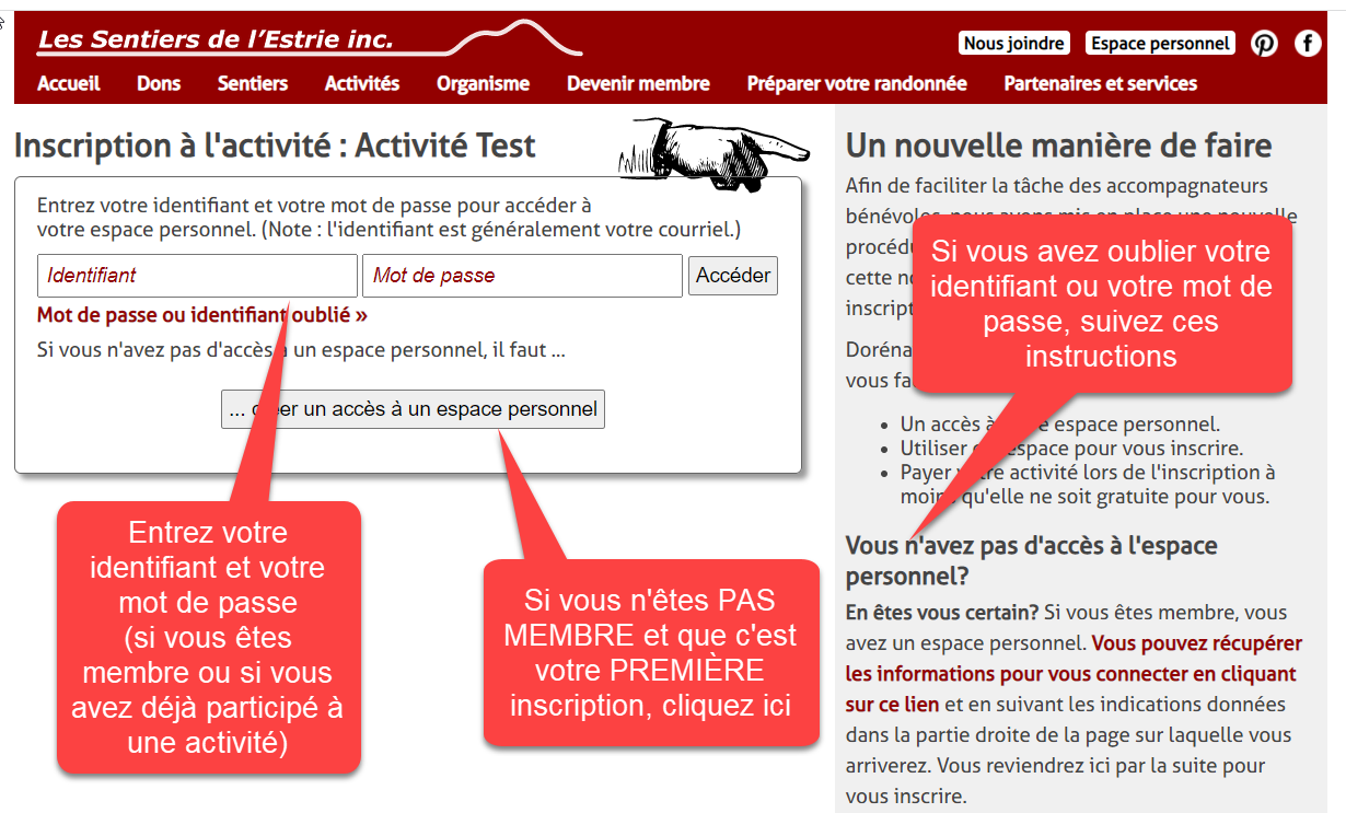 Si vous vous êtes déjà inscrit à une activité en ligne ou que vous avez déjà créé un espace personnel par le passé, vous devez suivre les mêmes instructions que pour les membres (Cliquez ici »). Si vous avez oublié votre identifiant ou votre mot de passe, voir cette section.