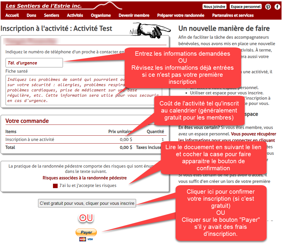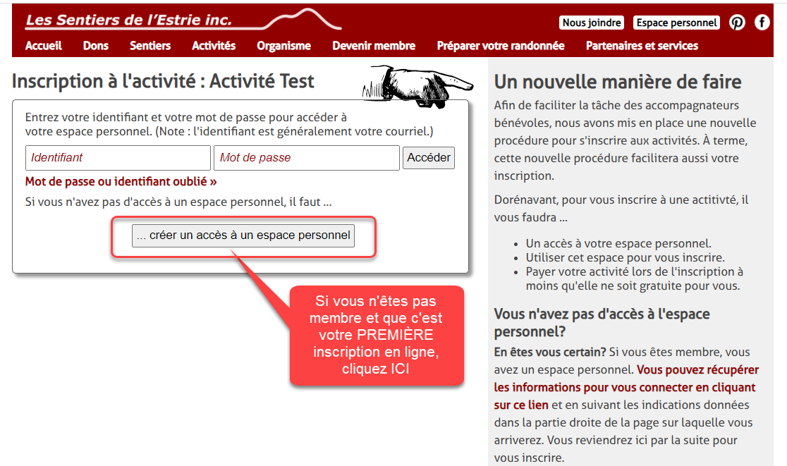 Si vous n'êtes pas membre et que c'est la première fois que vous vous inscrivez en ligne à une activité, il faudra que vous créiez un accès un espace personnel. Voir ici »