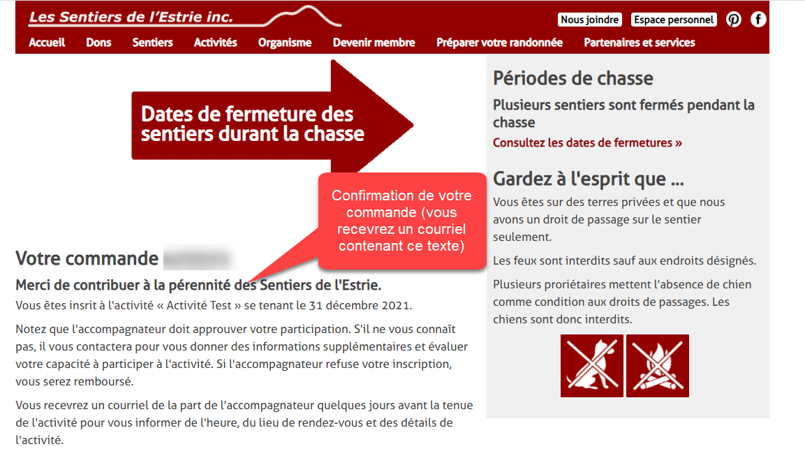 Il y a un délai normal de quelques minutes entre le moment du paiement de l'inscription et la réception du courriel de confirmation. Il arrive que les courriels envoyés par notre site se retrouvent dans les courriels indésirables. Regardez à cet endroit si vous ne recevez rien. Vous pouvez également ajouter marche@lessentiersdelestrie.qc.ca dans votre liste de destinataires de confiance.