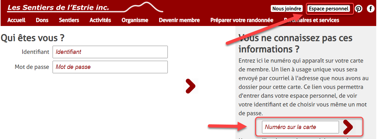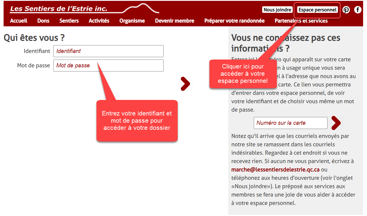 Si vous êtes membre, vous avez déjà un espace personnel qui a été créé lors de l'affiliation. Suivez les instructions à droite dans la page suivante pour récupérer vos informations avec votre numéro de membre. https://www.lessentiersdelestrie.qc.ca/login/login.html