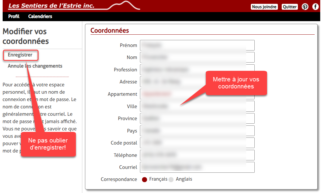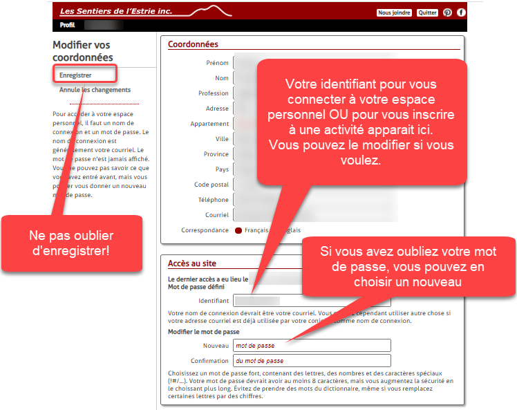 Vous pouvez ensuite modifier vos coordonnées. Ne pas oublier de cliquer sur le lien "Enregistrer" pour enregistrer les changements.