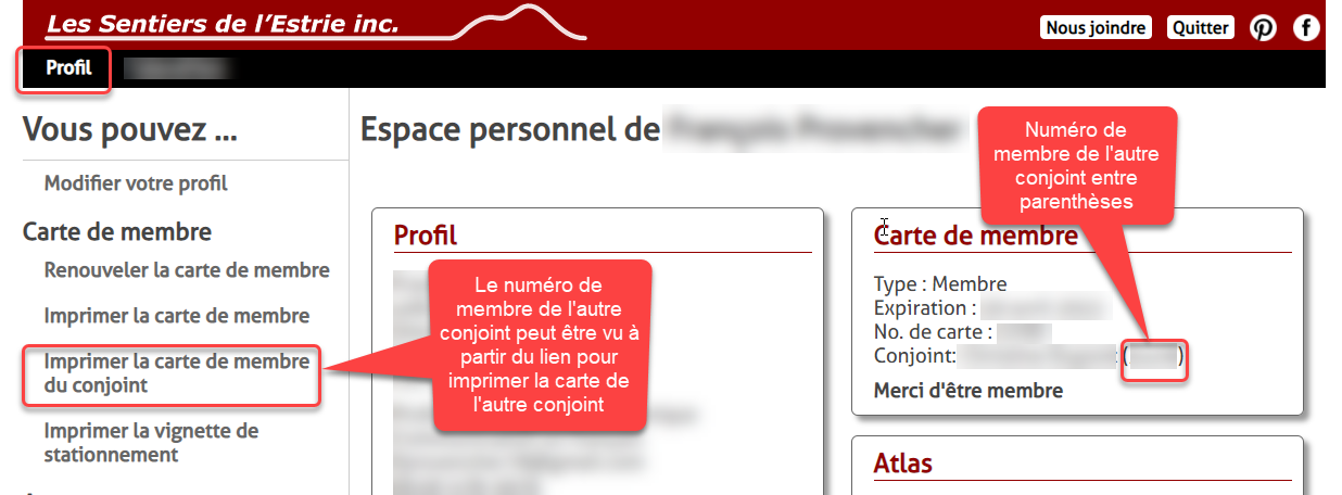 Dans l'espace personnel d'un des conjoints, vous pouvez retrouver le numéro de membre de l'autre conjoint. Vous le retrouverez soit dans l'information sur les cartes de membre (à droite) ou en cliquant sur le lien pour imprimer la carte de l'autre conjoint (à gauche).